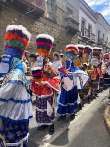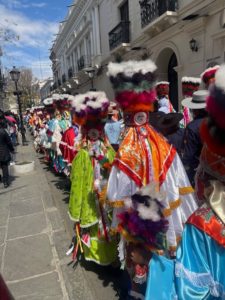 A coté de cette crise économique, j’ai trouvé la population bolivienne toujours aussi attachante. Elle manifeste une joie de vivre en organisant beaucoup de fêtes. Lors de mon séjour, il y a eu la Fête des Chunchos (commémorant les lépreux) C’est une procession de personnes déguisées avec de chapeaux à plume, marchant en cadence avec des pas réglés par une crécelle, qui me rappelait les Gilles de Binche.